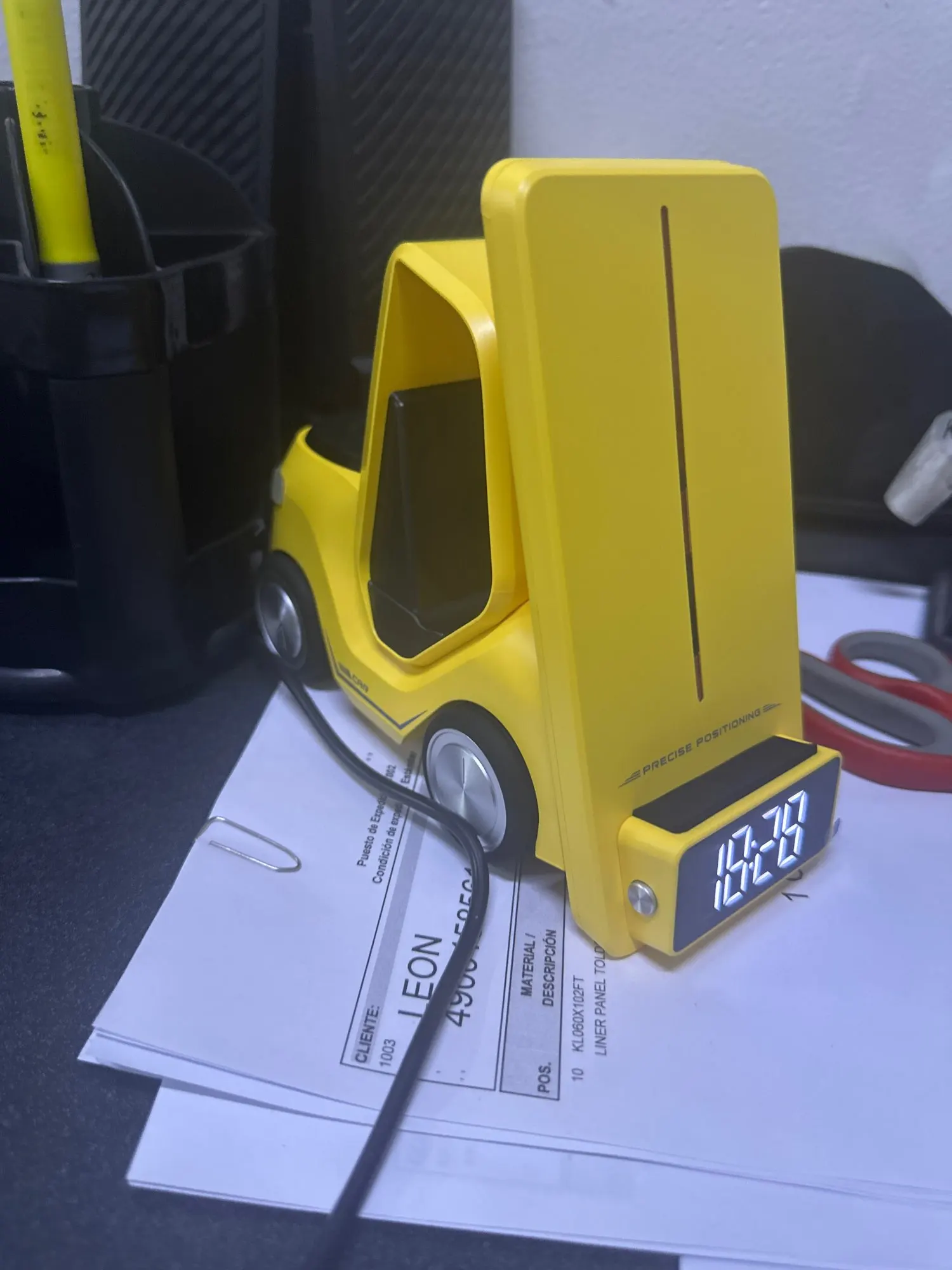 Forklift Wireless Charger Station – A stylish, multifunctional charging dock designed like a forklift, supporting wireless charging for phones and earbuds while doubling as a digital clock and lamp.