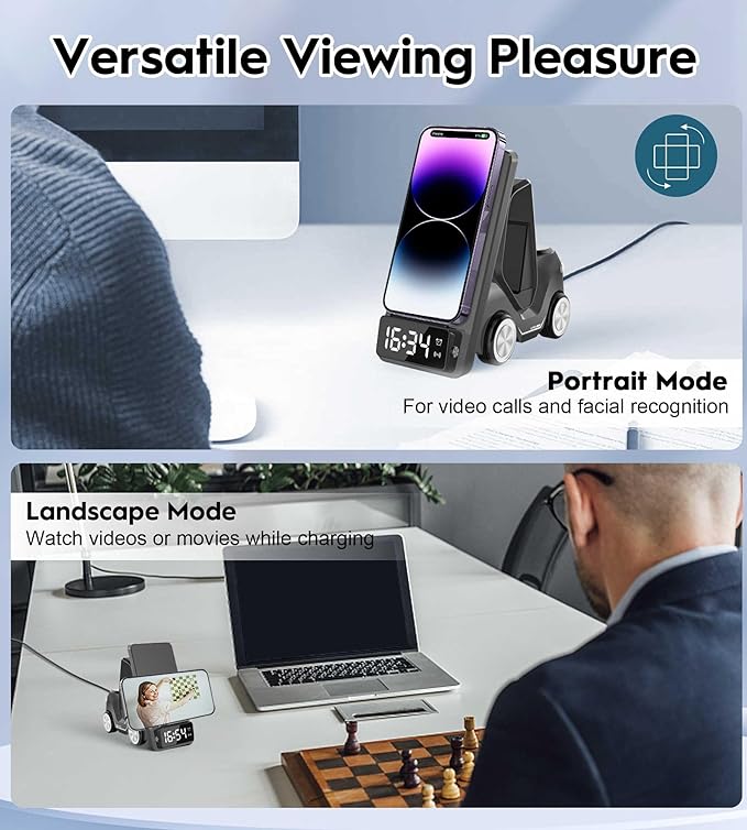 Multi-angle viewing – Adjustable stand allows portrait or landscape mode for calls, video streaming, or facial recognition while charging.